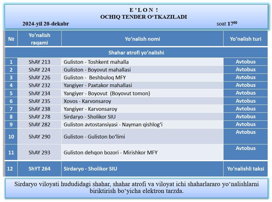 O‘zbekiston Respublikasi Vazirlar Mahkamasining 2021- yil 6-dekabrdagi 738-sonli qarori bilan tasdiqlangan “Shahar, shahar atrofi, shaharlararo (Qoraqalpog‘iston Respublikasi va viloyatlar ichida hamda Qoraqalpog‘iston Respublikasi, Toshkent shahar va viloyatlararo) va xalqaro yo‘nalishlarni biriktirish bo‘yicha ochiq tenderlarni elektron tarzda tashkil etish va o‘tkazish tartibi to‘g‘risida NIZOM”ga muvofiq: