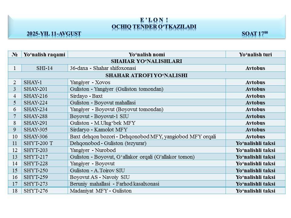 Sirdaryo viloyati hududidagi shahar, shahar atrofi va viloyat ichi shaharlararo yo‘nalishlarni biriktirish bo‘yicha elektron tarzda ochiq tender o‘tkaziladi.