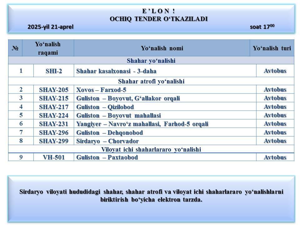 O‘zbekiston Respublikasi Vazirlar Mahkamasining 2021- yil 6-dekabrdagi 738-sonli qarori bilan tasdiqlangan “Shahar, shahar atrofi, shaharlararo (Qoraqalpog‘iston Respublikasi va viloyatlar ichida hamda Qoraqalpog‘iston Respublikasi, Toshkent shahar va viloyatlararo) va xalqaro yo‘nalishlarni biriktirish bo‘yicha ochiq tenderlarni elektron tarzda tashkil etish va o‘tkazish tartibi to‘g‘risida NIZOM”ga muvofiq: