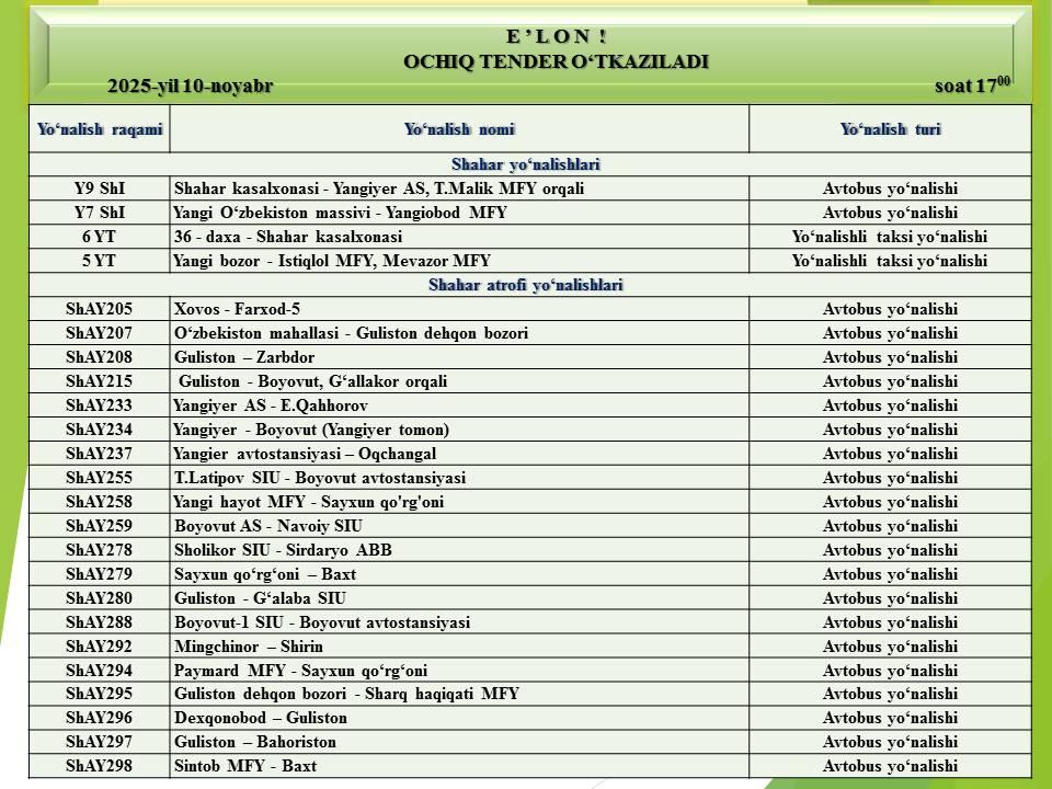 O‘zbekiston Respublikasi Vazirlar Mahkamasining 2021- yil 6-dekabrdagi 738-sonli qarori bilan tasdiqlangan “Shahar, shahar atrofi, shaharlararo (Qoraqalpog‘iston Respublikasi va viloyatlar ichida hamda Qoraqalpog‘iston Respublikasi, Toshkent shahar va viloyatlararo) va xalqaro yo‘nalishlarni biriktirish bo‘yicha ochiq tenderlarni elektron tarzda tashkil etish va o‘tkazish tartibi to‘g‘risida NIZOM”ga muvofiq: