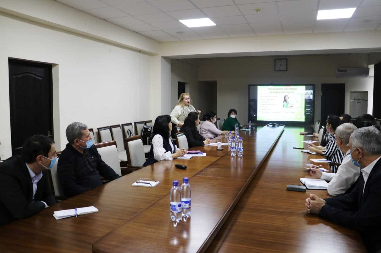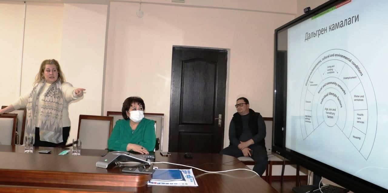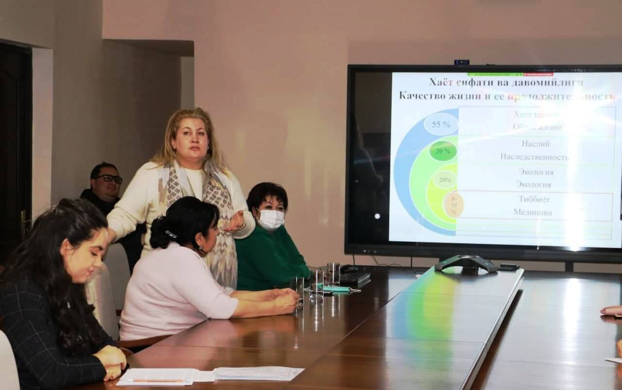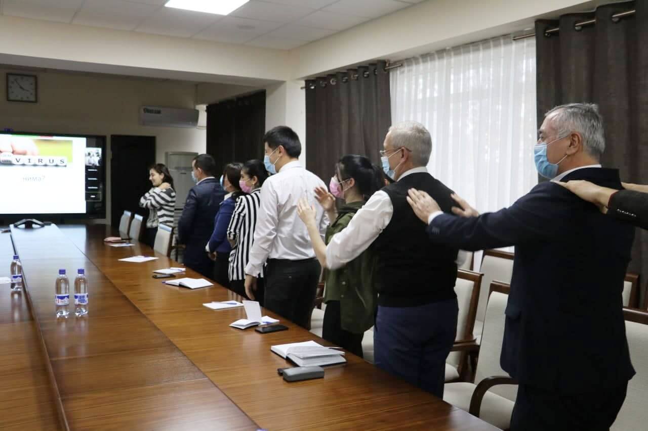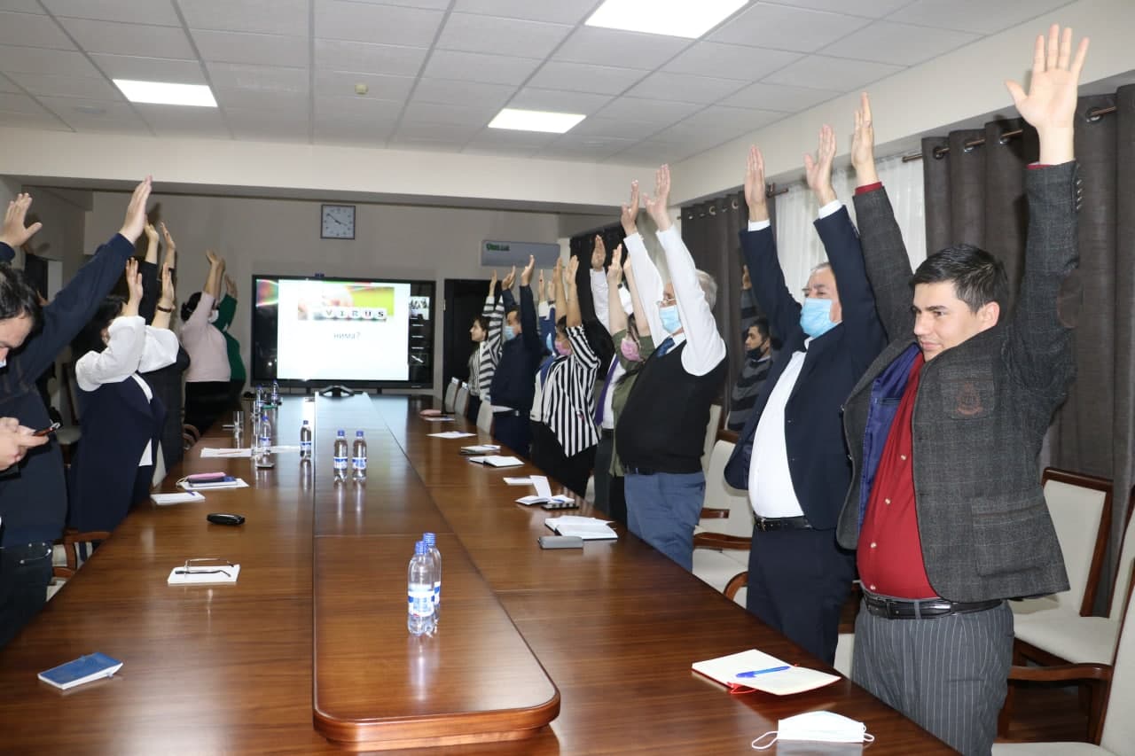 Shirinxon Xabibullaeva esa jismoniy tarbiya va gimnastika bilan muntazam shug‘ullanish har bir kishining kundalik hayot tarziga aylanishi kerakligini aytib o‘tdi. Ko‘pchiligimiz kun davomida 6-7 soat o‘tirishni taqozo qiladigan mehnat faoliyatiga bog‘lanib qolganmiz. Bu esa diabet, yurak xuruji, ortiqcha vazn kabi xastaliklarning sababchisiga aylanishi mumkin. Ana shunday salbiy oqibatlarning oldini olish uchun esa ish vaqtida 10-15 daqiqa vaqt ajratib oyoq qo‘llarimizni, yelka va bo‘yin qimslarimizni harakatga keltirib chigal yozdi mashqlarini bajarish juda muhim ekanligi va bunga har bir hodim odatlanishi lozimligi tushuntirildi.